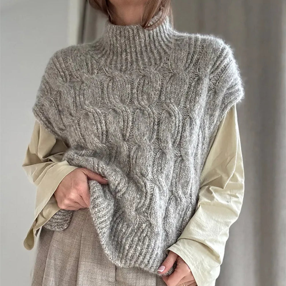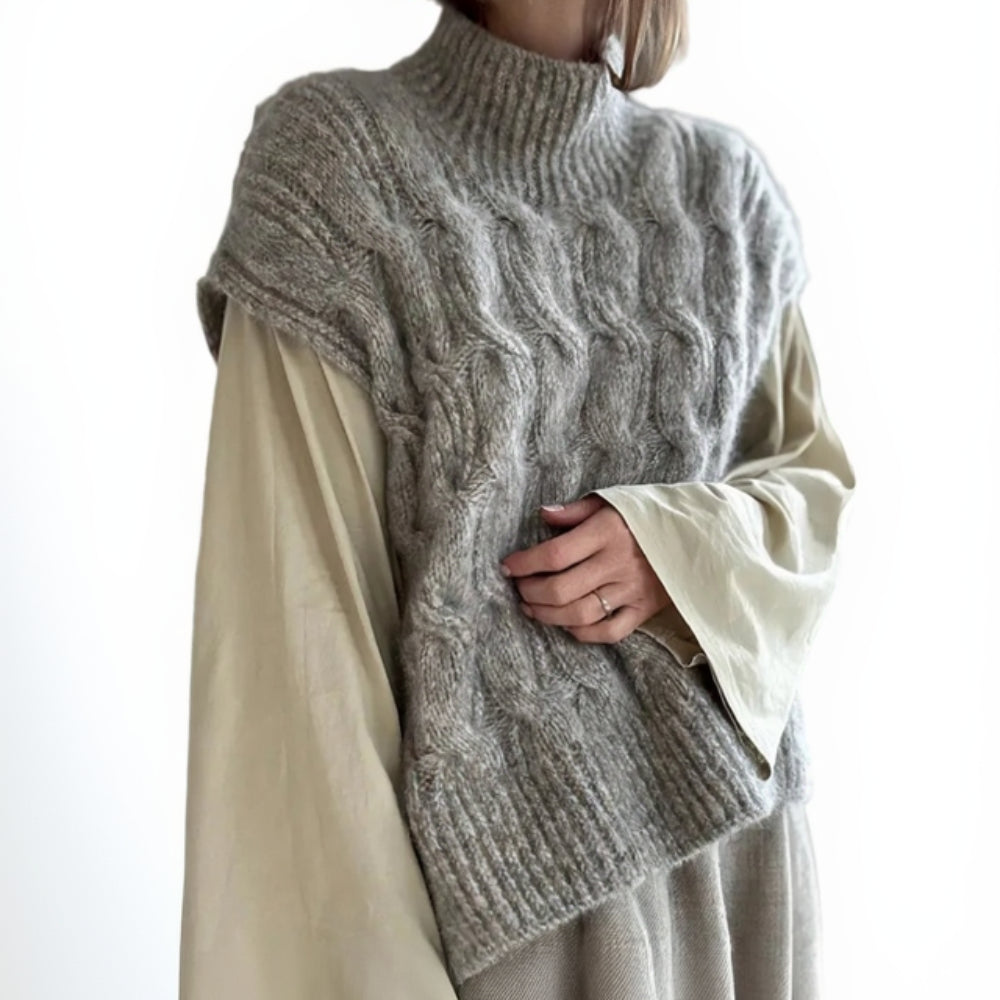 Die Weste kann mit einem positive ease zwischen 10 und 40 cm gestrickt werden. Bitte beachte, dass die Schulterpartie je nach Größe um ein durchgehendes Zopfmuster variiert.