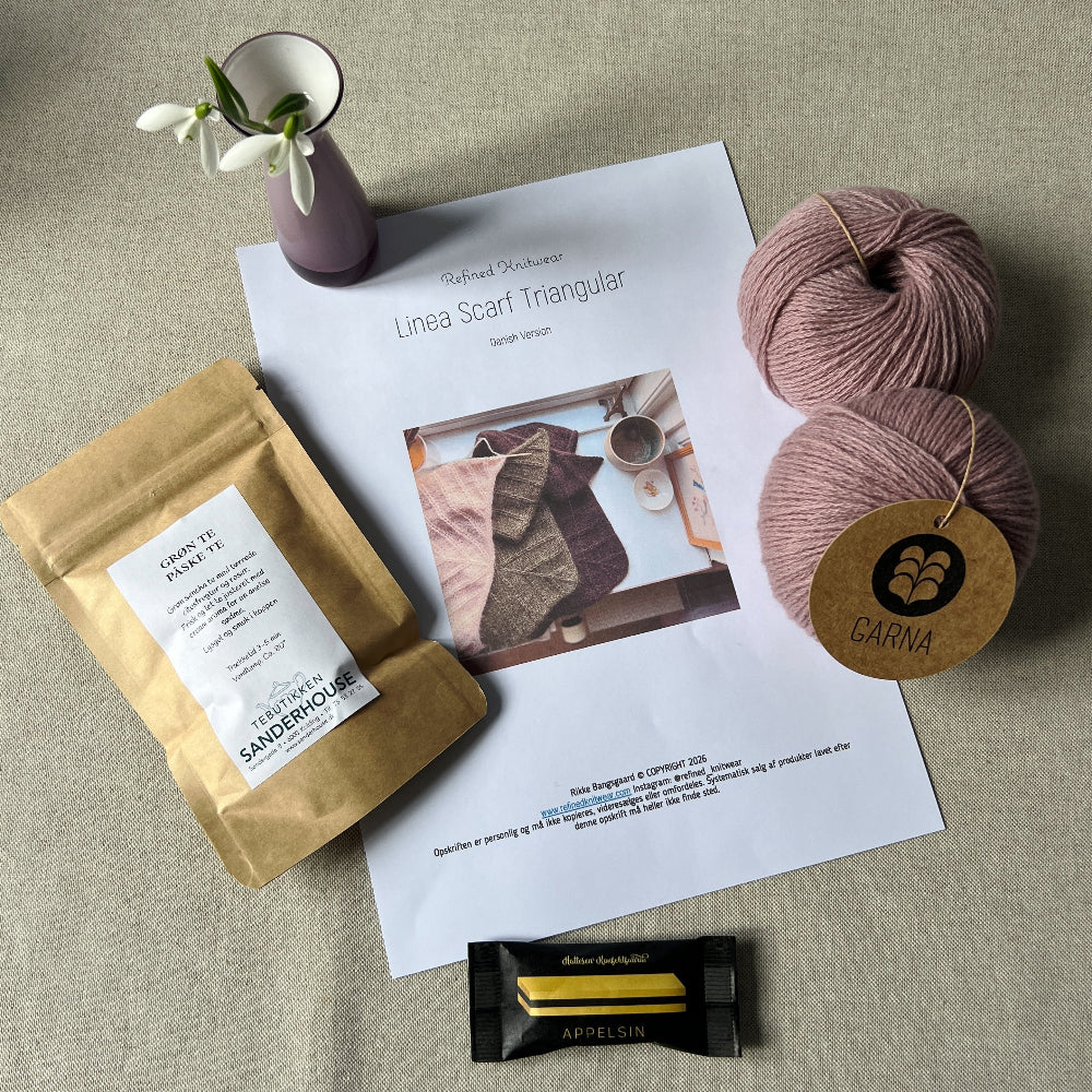 Mit dem Osterei für den Linea Scarf Triangular von Refined Knitwear bekommst Du GARNA Luxusgarn für einen wunderschönen Dreiecksschal mit einem einfachen, aber ausdrucksstarken Muster.